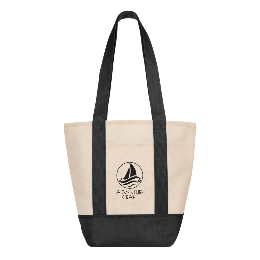 Features an 80 GSM non-woven polypropylene build with a classic two-tone design. Perfect for snacks or small essentials, it includes a front slash pocket. Perfect for events, hotels, retreats, swag bags, or branded giveaways.