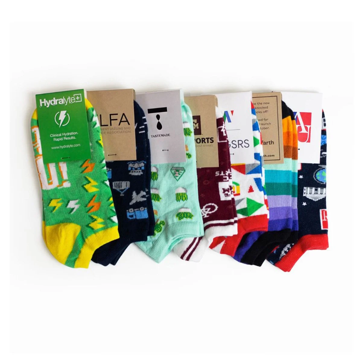 Made in the USA from high-quality, breathable yarns. Vibrant, fade-resistant designs with a low-profile, nearly no-show fit. Perfect for corporate gifts, hotel guests, events, retreats, and branded giveaways. One size fits most (6–12).