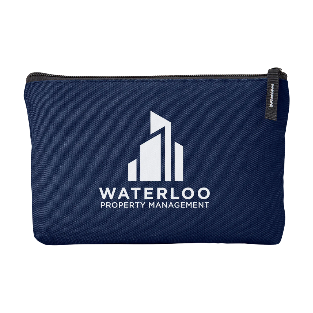 This sleek eco-friendly pouch keeps daily essentials organized with a zipper closure and durable 600D recycled polyester construction. Lined with 210D recycled polyester. Perfect for hotel guest amenities, boutique swag gifting, or Airbnb welcome kits.