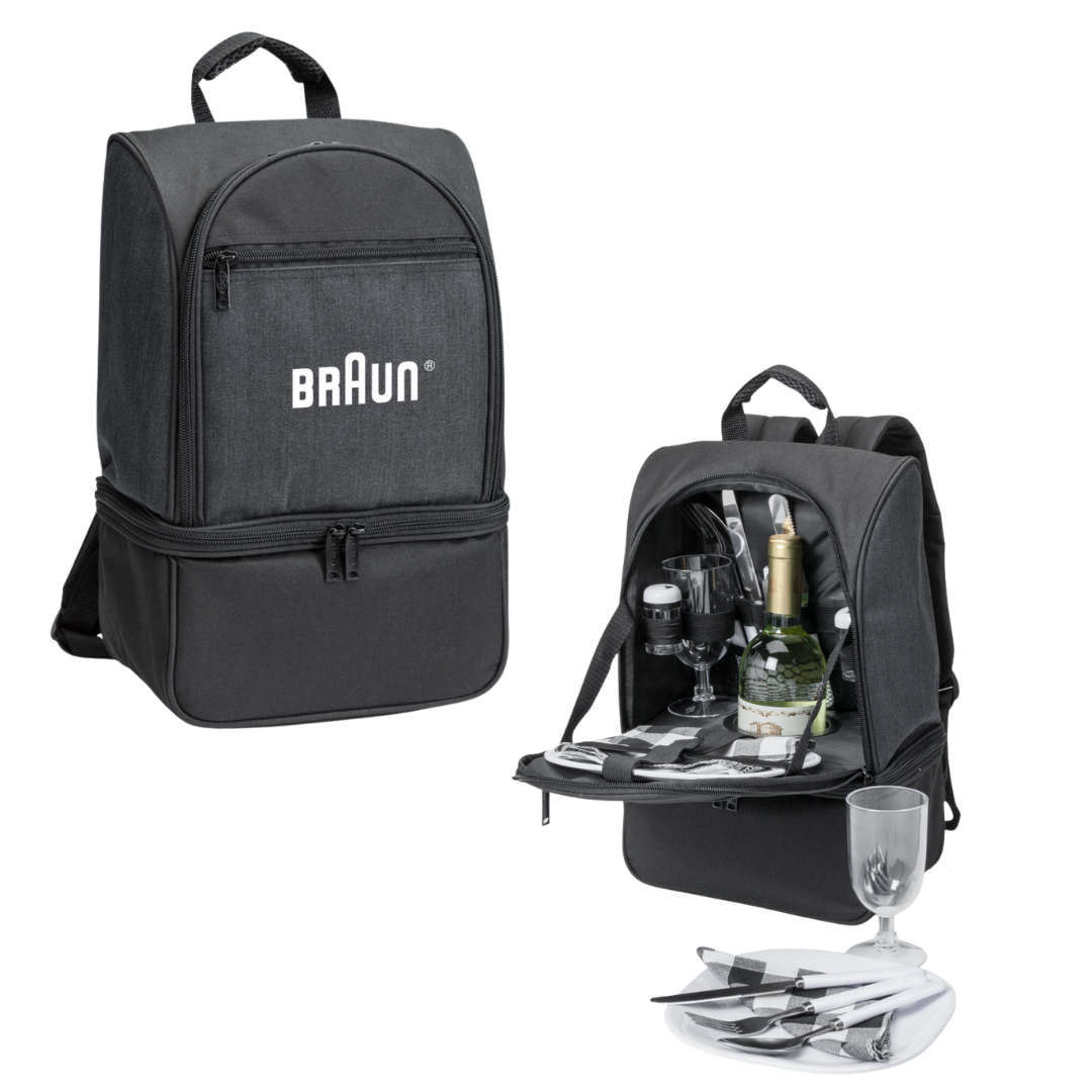 A picnic set in a durable 1200D polyester bag. Includes service for two with tableware and accessories, plus bottle support (wine not included); ideal for outdoor dining, travel experiences, resort amenities, or corporate gifting.