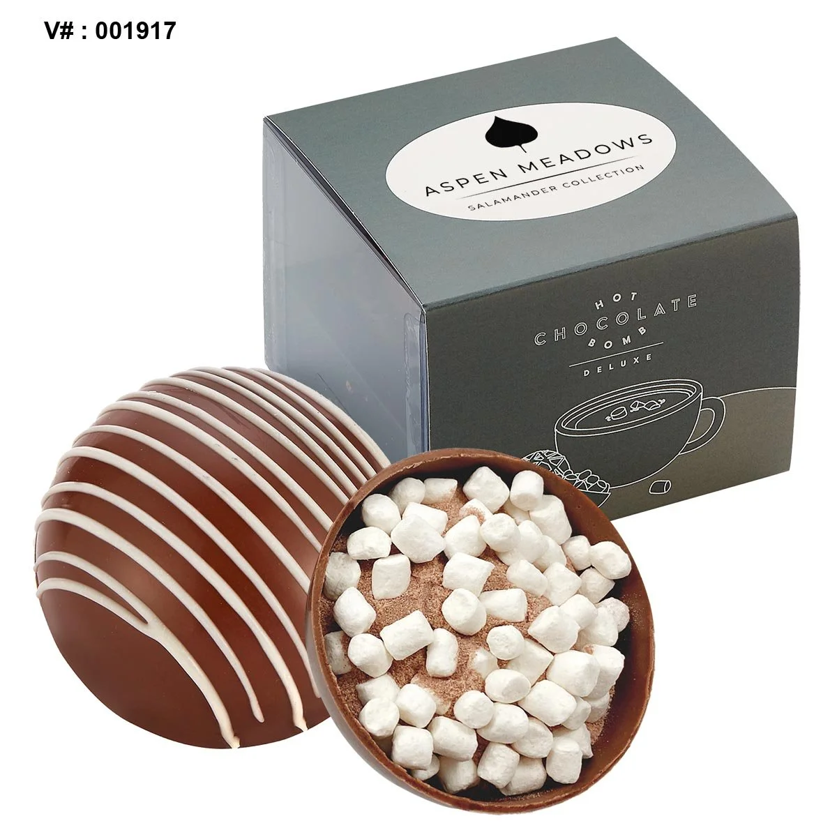 Make your next promotional event SWEET with a Hot Chocolate Bomb! Simply pour hot water or milk over the bomb and watch it activate! Our bombs are made to order right here in our factory (based in New York) from the finest Belgian Chocolate and ingredients. Plus, get a bigger treat for your buck! Our bombs are HUGE at 2.375” diameter! Customize the hang tag with your own artwork or put your logo on one of our stock designs.