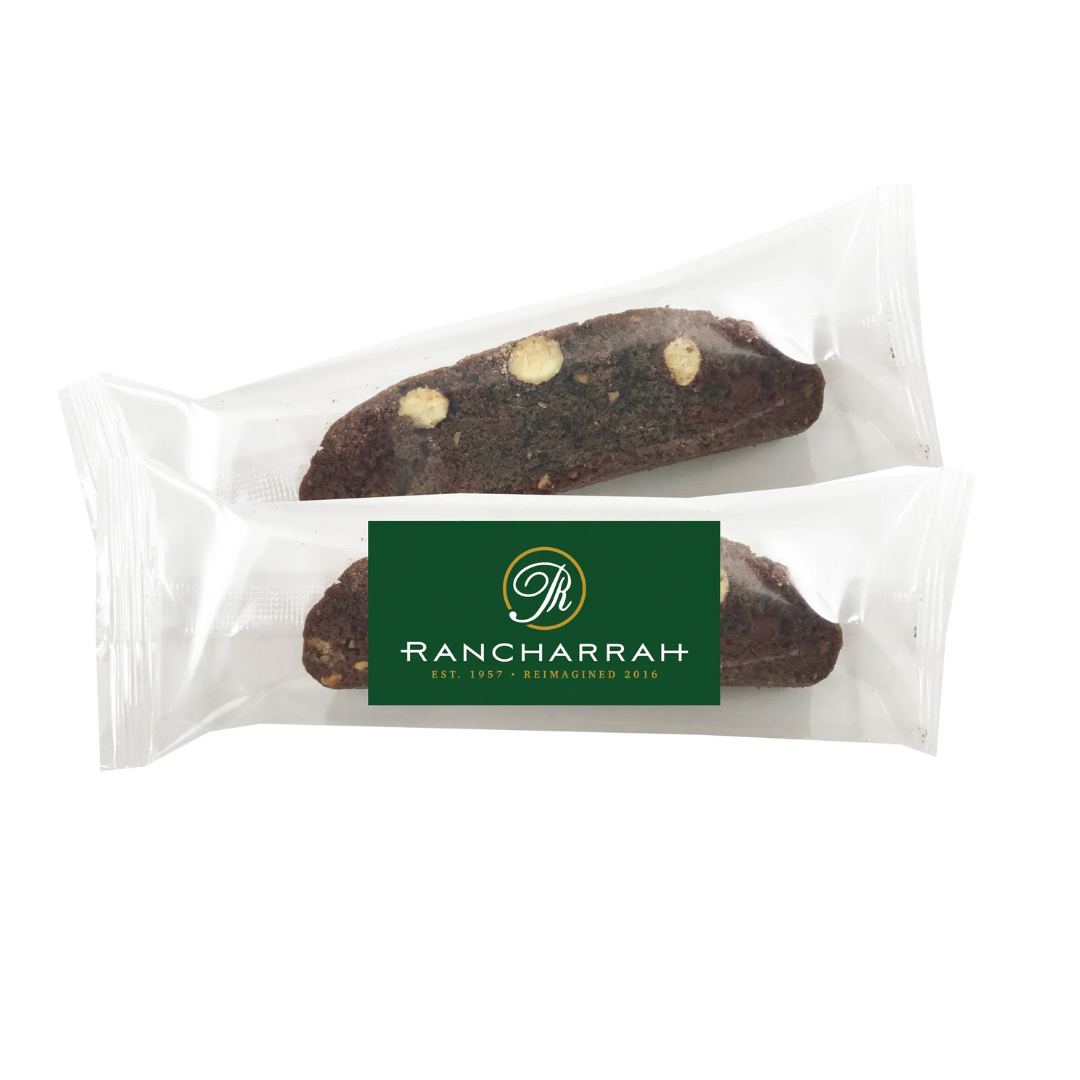 Two crisp, golden biscotti in five gourmet flavors are presented in a custom-branded box with a peek-through window. Perfect for corporate gifting, hospitality welcome kits, café pairings, Airbnb amenities, or trade show and event handouts.