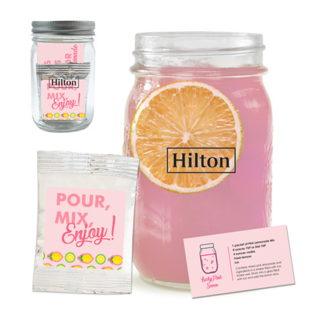 This 12 oz mason jar with pink lemonade mix delivers refreshing flavor and can be branded for boutique hotels, summer event hospitality, corporate outdoor gatherings, or café specialty offerings.