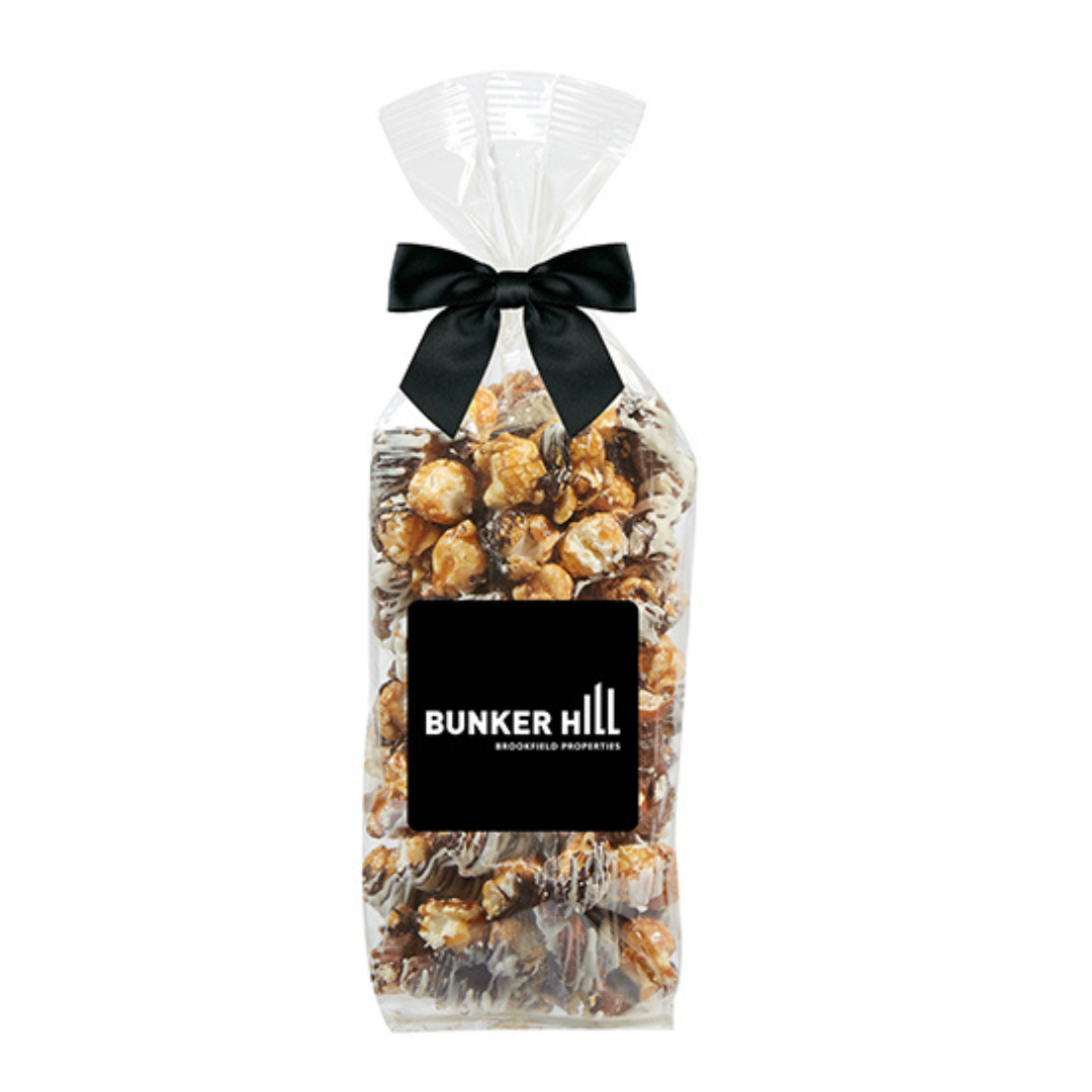This gourmet popcorn gift bag features flavors like caramel latte, chocolate pretzel, and seasonal varieties. Ideal for boutique hotel amenities, winery promotions, trade shows, or client and event giveaways.