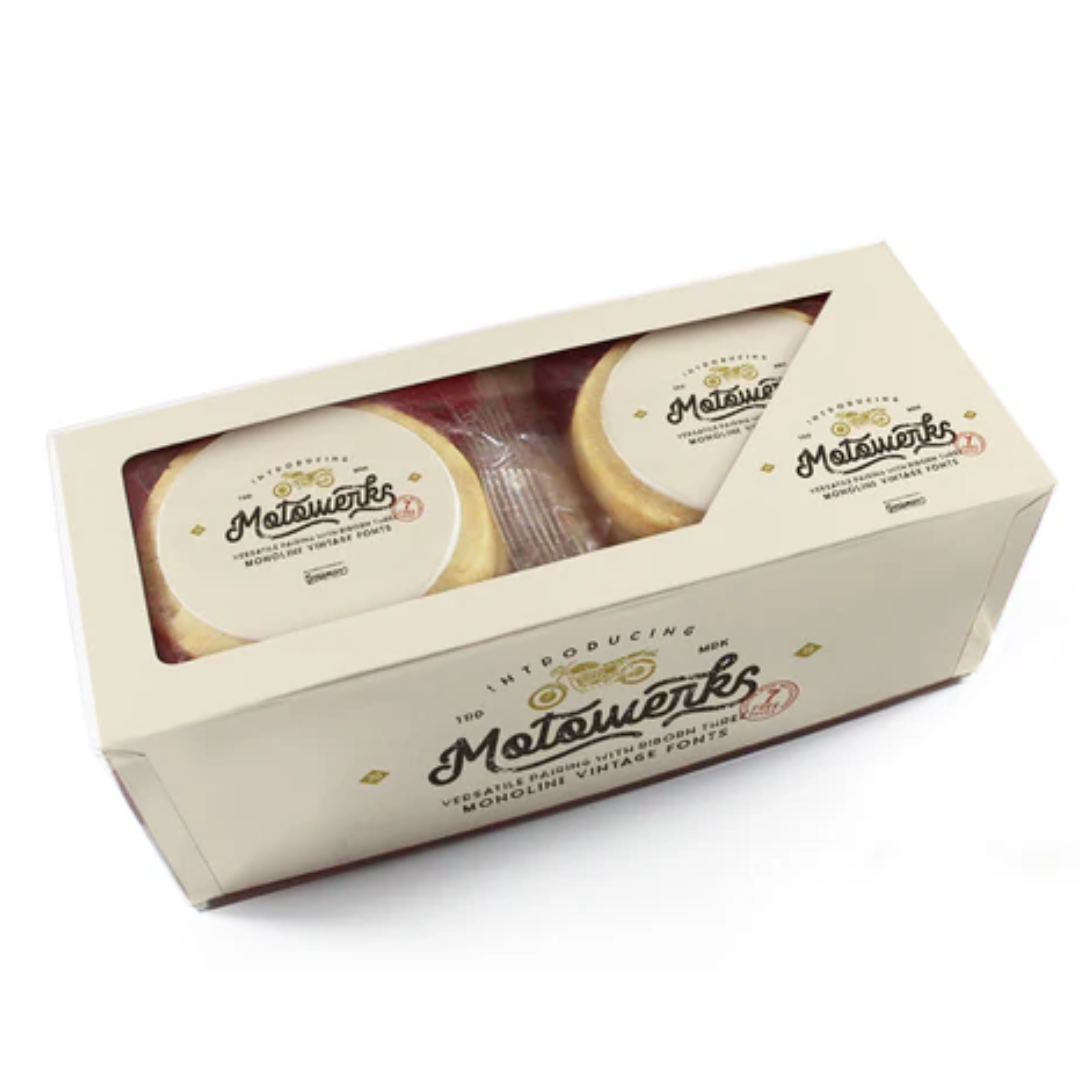 This custom box holds two mini all-butter shortbread cookies with royal icing and your logo or design in edible ink. The peek-through window and branded exterior make it perfect for café counter displays, hospitality welcome kits, or event favors.