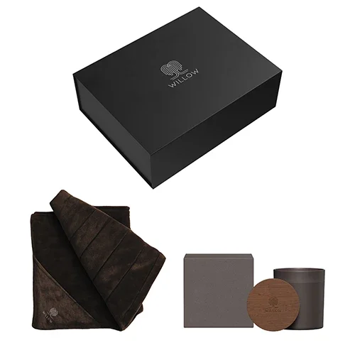 This gift set includes a cozy Perry blanket, a Summit glass candle with acacia wood lid and a large magnetic gift box, making it ideal for client appreciation, executive gifting and branded hospitality welcome kits.