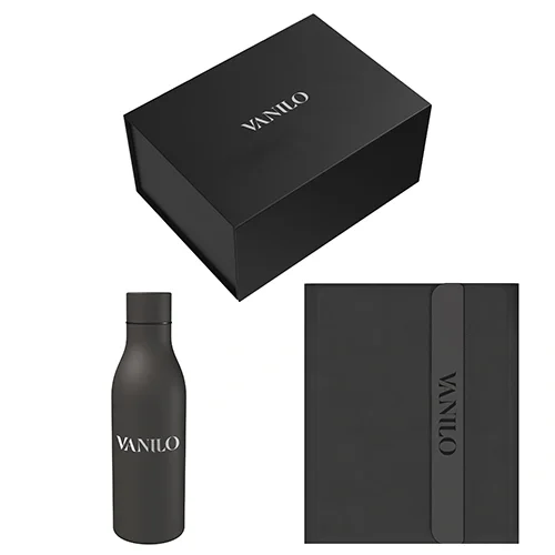 This premium gift set includes a hard cover journal, ballpoint pen and stainless steel bottle in a magnetic gift box, making it suitable for client onboarding, branded events and executive appreciation programs.
