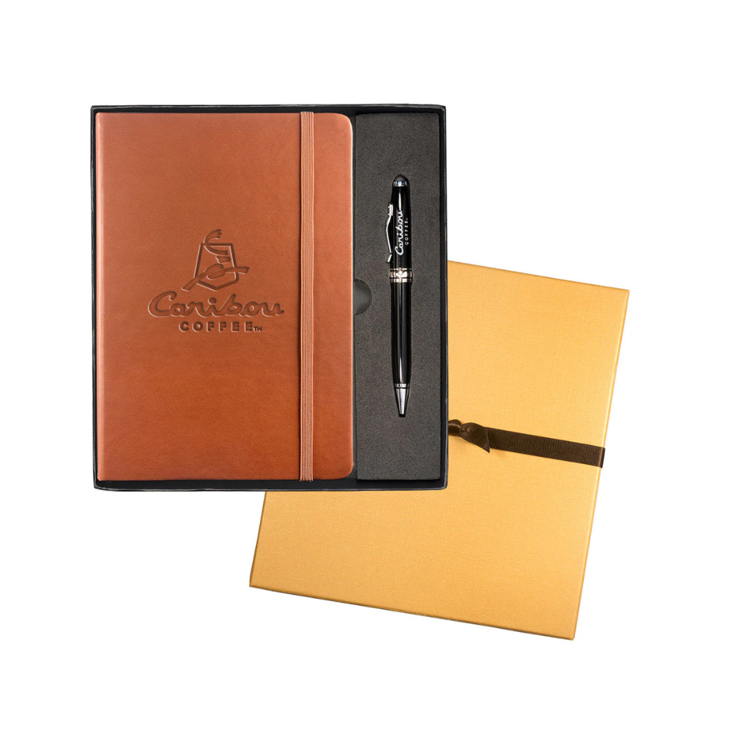 This set includes a Tuscany hard cover journal and an executive stylus pen, making it well suited for professional meetings, branded conference materials, hospitality reception spaces and client appreciation gifts. This set is packaged in a gift box.